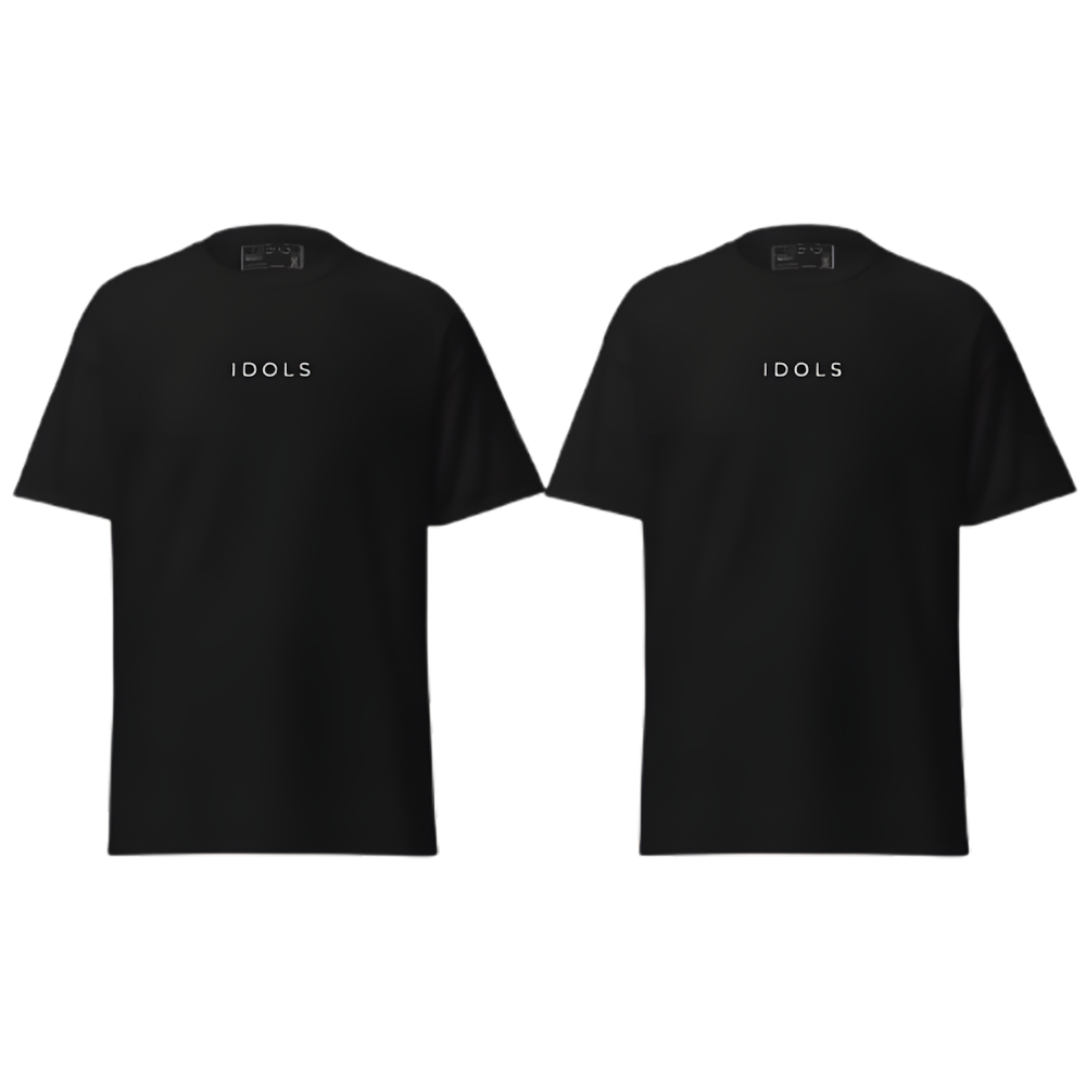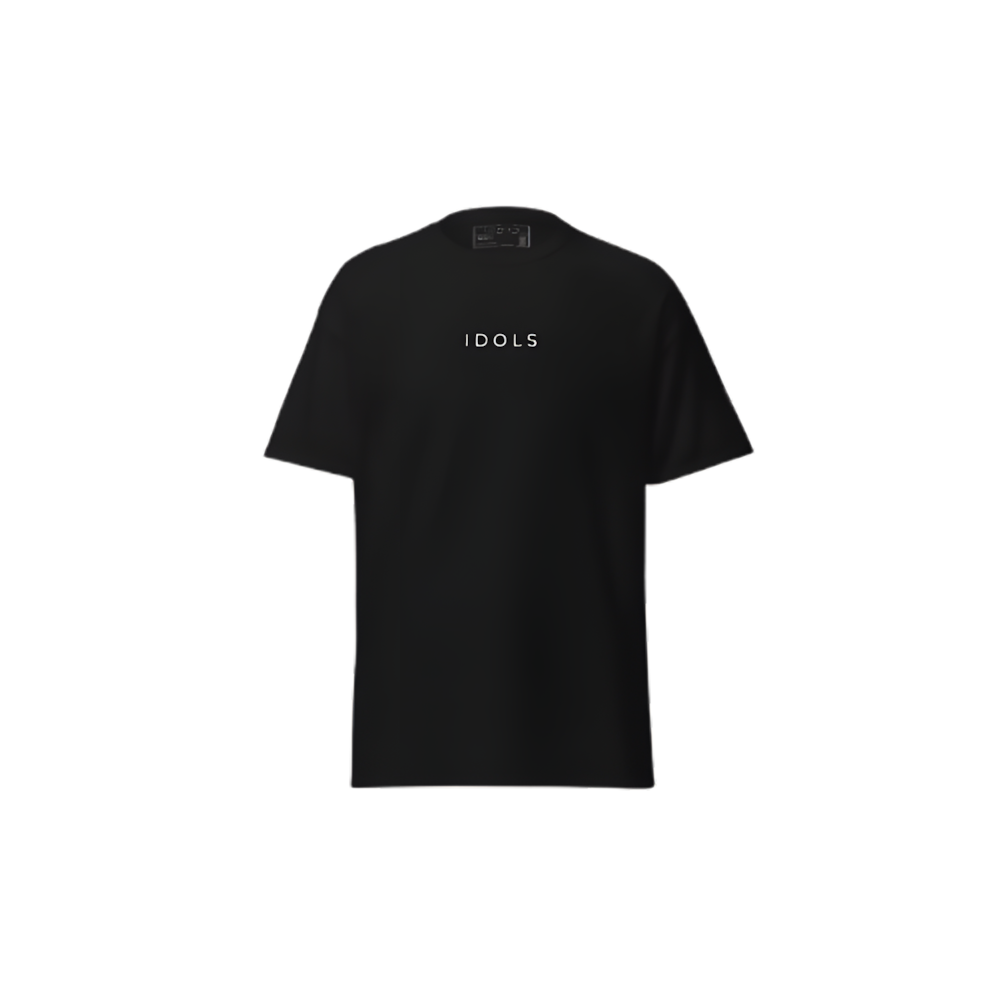 Black t-shirt with 'IDOLS' logo on a white background, Shopidols